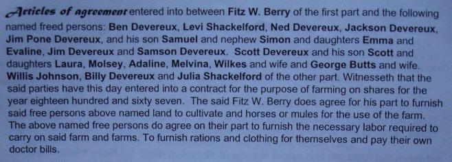 Sharecropping or labor contracts often contain information about family relationships.Scott Devereux signed a sharecropping contract with Fitz W.Berry on. The contract stipulated that Scott and his children were to farm the Town Creek Plantation of Anna Devereux, now deceased. Anna had died October 3, 1866. The value of these contracts is apparent when one realizes that relationships were not recorded in the 1870 United States census. For example, Scott Devereux appeared in the 1870 census as head of this household: