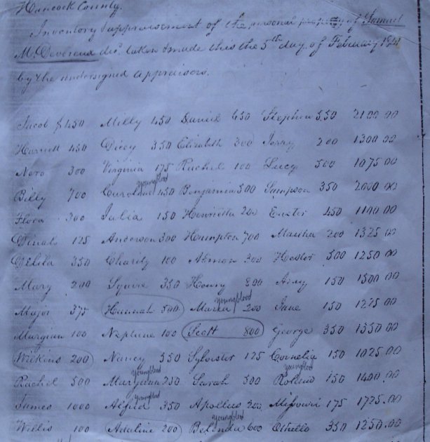 Devereux left a will signed April 21, 1834. He bequeath to his wife Anna, Henry and his wife Hester, her children Major, Squire, and Maria; Scott, his wife Hannah and her child Wilkin; Rachel and her son George. These slaves he gave to Anna in lieu of her dower slaves. The term dower slaves refers to slaves given as a wedding gift. To his son Samuel he willed Daniel. To his son Crawford he gave Stephen. He willed Ben to his son William Woods. He willed Francis to his daughter Georgia Ann. He bequeath Sarah to his daughter Lobelia Ann. The remainder of his property was to be kept together until the children became of age. At such time the children would receive an equal share of the remaining property.